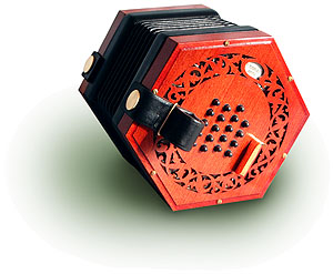Considering its use of accordion reeds the sound is more like a concertina than an accordion (though people listening usually were able to identify the type of reeds used). It is bright and fairly loud. Not a singer's instrument, but it will make itself heard in a session without being obtrusive. The instrument might have been brighter with metal ends, but I personally think that it is bright enough already, and that the wood plays an important role in making the sound pleasant. For those who want to sweeten the tone a little then it should not be difficult to add leather baffles (maybe another optional extra?).