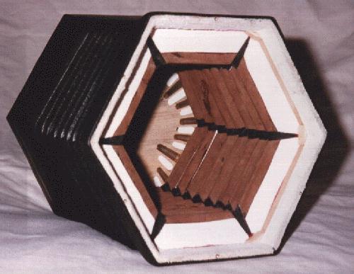 This shows the interior of the concertina after the reed pan has been removed. The reed pan for the far end of the concertina is visible.